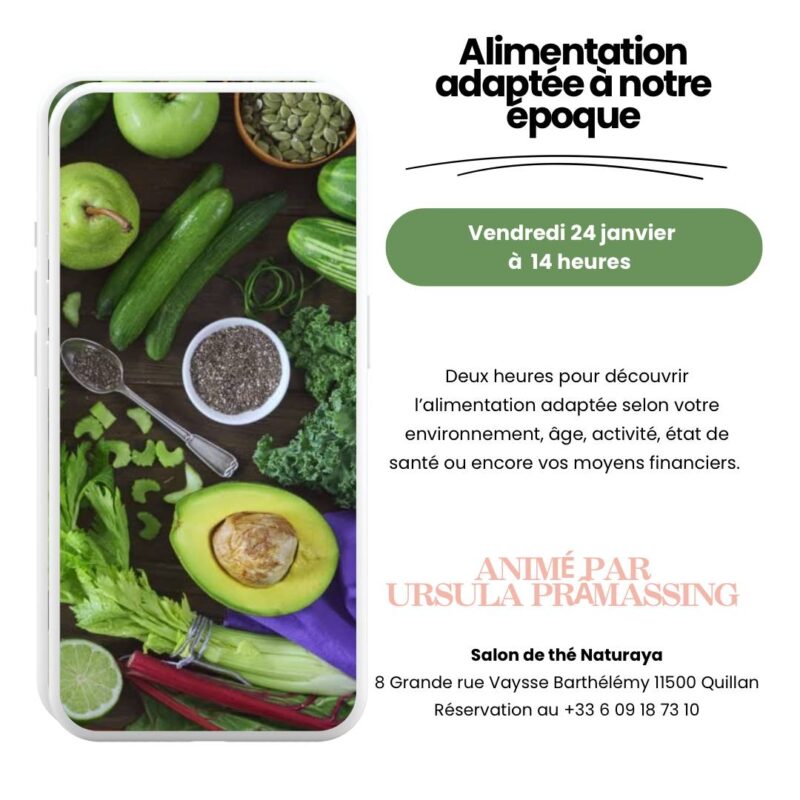 Rendez-vous vendredi 24 janvier à 14h00 au salon de thé Naturaya à Quillan et découvrez comment adapter votre alimentation selon l’environnement dans lequel vous vivez.