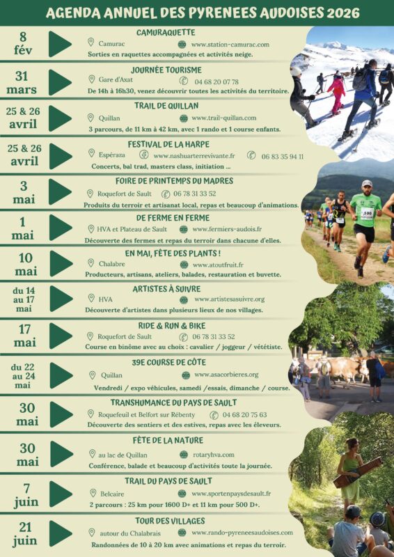 Nous somme heureux de vous faire parvenir « l’agenda annuel des Pyrénées Audoises », qui vous permettra de planifier dès à présent vos prochaines sorties de l’année.