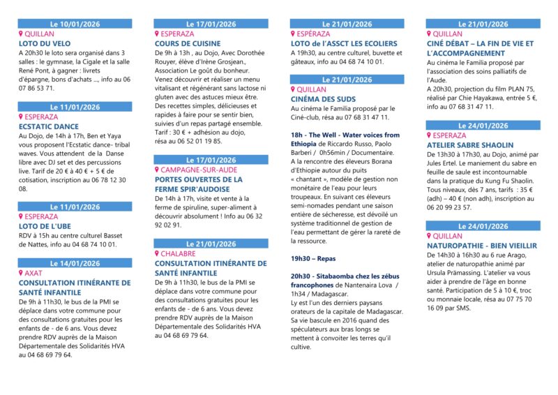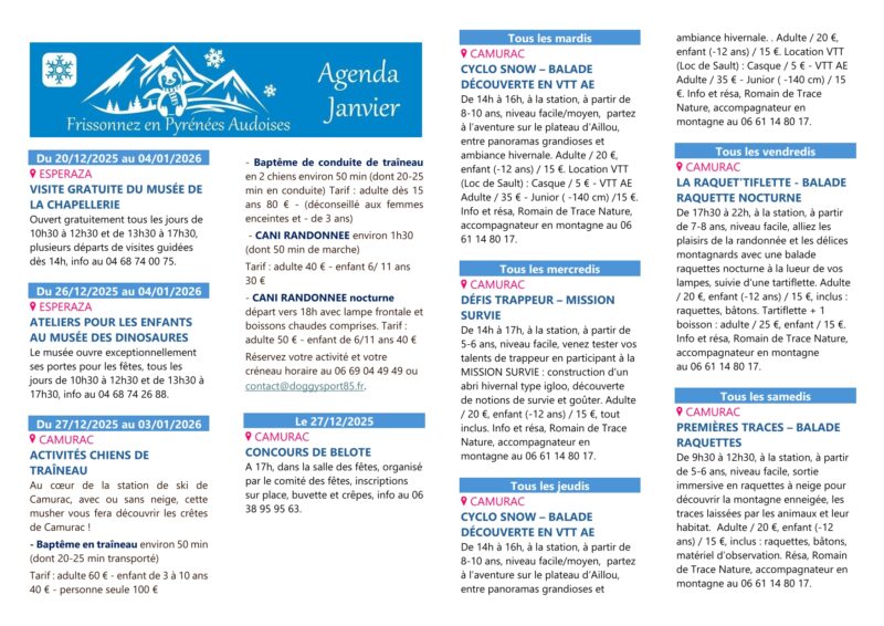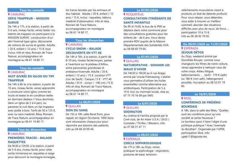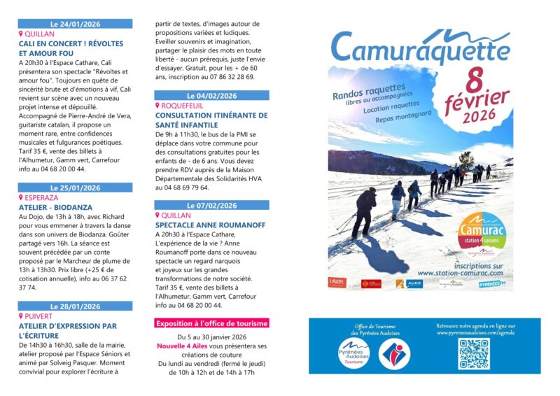 Agenda du mois de janvier des Pyrénées Audoises de admin | 19 décembre, 2015 - 14h39 |2 février, 2026 Archives Voir le contenu de ce mail en ligne Madame, Monsieur, Nous sommes heureux de vous faire parvenir l’agenda du mois de janvier des Pyrénées Audoises pour planifier déjà vos prochaines sorties ! Retrouvez toutes les animations du territoire des Pyrénées Audoises également sur notre agenda en ligne. Agenda Toute l’équipe de l’Office de Tourisme vous souhaite de très belles fêtes de fin d’année. Audrey MAUGARD Référente observatoire, animations, documentation Office de Tourisme des Pyrénées Audoises Square A. Tricoire – 11500 QUILLAN Tél : 04 68 20 07 78 www.pyreneesaudoises.com Veuillez laisser ce champ vide Inscrivez-vous pour recevoir la lettre hebdomadaire(envoi chaque début de semaine)des infos en Haute Vallée de l'Aude Vérifiez votre boite de réception ou votre répertoire d’indésirables pour confirmer votre abonnement. Pour marque-pages : Permalien.