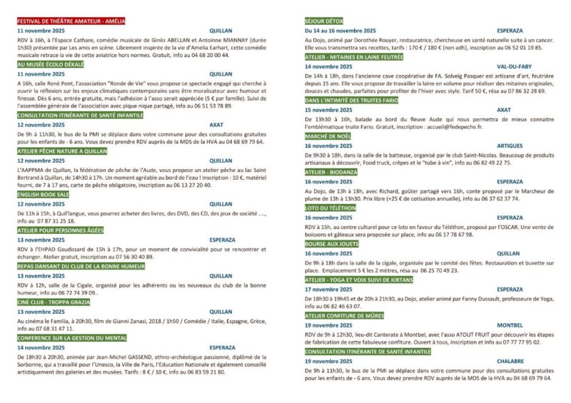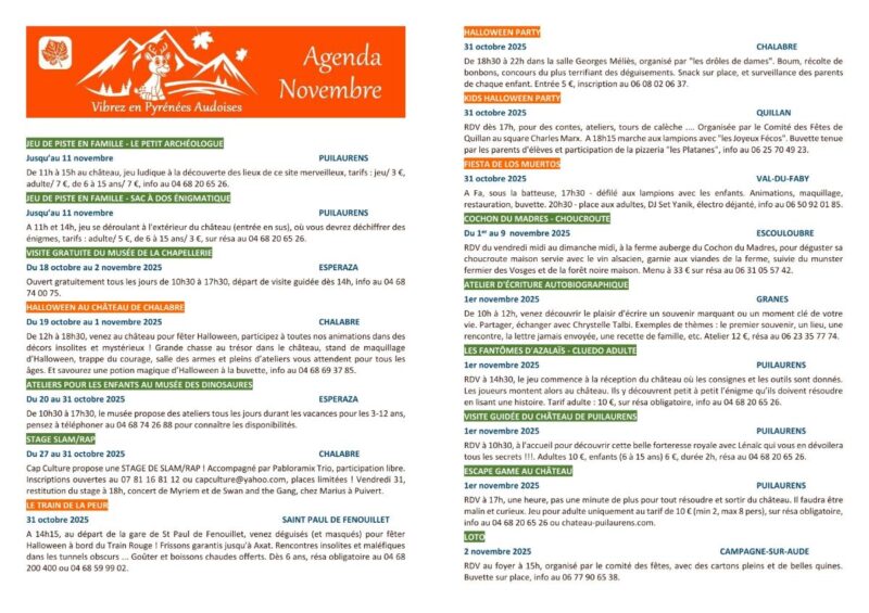 Agenda du mois de novembre des Pyrénées Audoises de admin | 20 octobre, 2015 - 14h22 |1 décembre, 2025 Archives Voir l’agenda en ligne Madame, Monsieur, Nous sommes heureux de vous faire parvenir l’agenda du mois de novembre des Pyrénées Audoises pour planifier déjà vos prochaines sorties ! Retrouvez toutes les animations du territoire des Pyrénées Audoises également sur notre agenda en ligne. Agenda Toute l’équipe de l’Office de Tourisme vous souhaite une agréable journée, Audrey MAUGARD Référente observatoire, animations, documentation Office de Tourisme des Pyrénées Audoises Square A. Tricoire – 11500 QUILLAN Tél : 04 68 20 07 78 www.pyreneesaudoises.com Veuillez laisser ce champ vide Inscrivez-vous pour recevoir la lettre hebdomadaire(envoi chaque début de semaine)des infos en Haute Vallée de l'Aude Vérifiez votre boite de réception ou votre répertoire d’indésirables pour confirmer votre abonnement. Pour marque-pages : Permalien.