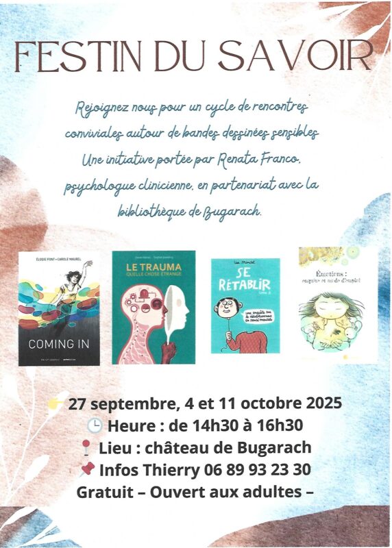 lectures collectives autour de bandes dessinées traitant de thèmes comme les émotions, le trauma, le rétablissement psychique et la sexualité contemporaine . Porté par Renata Franco, psychologue clinicienne, en partenariat avec la bibliothèque de Bugarach, il vise à utiliser la lecture comme outil de réflexion personnelle et collective. Ces rencontres, prévues les samedis après-midi (27 septembre, 4 et 11 octobre 2025), offrent un espace de dialogue et d’échange autour de récits sensibles et profonds. La lecture devient un moyen d’explorer des expériences de vie complexes tout en favorisant l’empathie et la résilience. En mêlant approche culturelle et accompagnement psychologique, le projet encourage une meilleure compréhension de soi et des autres. C’est une initiative innovante où livres et santé mentale se rencontrent pour nourrir à la fois l’esprit et le cœur. Plus d’informations à la bibliothèque de Bugarach auprès de Thierry (06 89 93 23 30)
