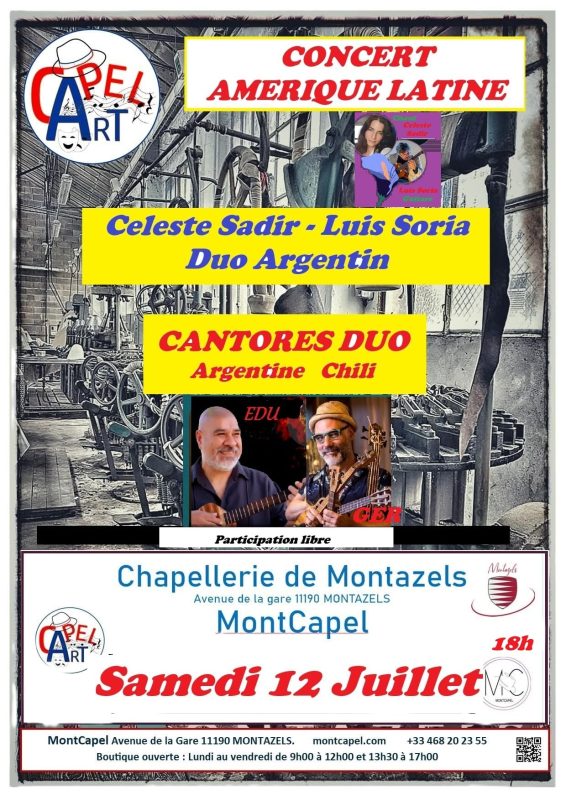 Un beau voyage en Amérique du Sud de l’Argentine au Chili, SAMEDI 12 JUILLET à 18h avec CELESTE SADIR & Luis SORIA et CANTORES DUO. A ne pas manquer !