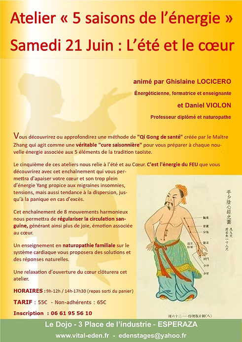Atelier de Qi Gong thérapeutique au dojo d’Espéraza le samedi 21 Juin de admin | 21 juin, 2015 - 21h32 |22 juin, 2025 Archives Sam 21 Juin 9h-12h & 14h-17h30 Atelier de Qi Gong thérapeutique Animé par Ghislaine Locicero et Daniel Violon Veuillez laisser ce champ vide Inscrivez-vous pour recevoir la lettre hebdomadaire(envoi chaque début de semaine)des infos en Haute Vallée de l'Aude Vérifiez votre boite de réception ou votre répertoire d’indésirables pour confirmer votre abonnement. Pour marque-pages : Permalien.