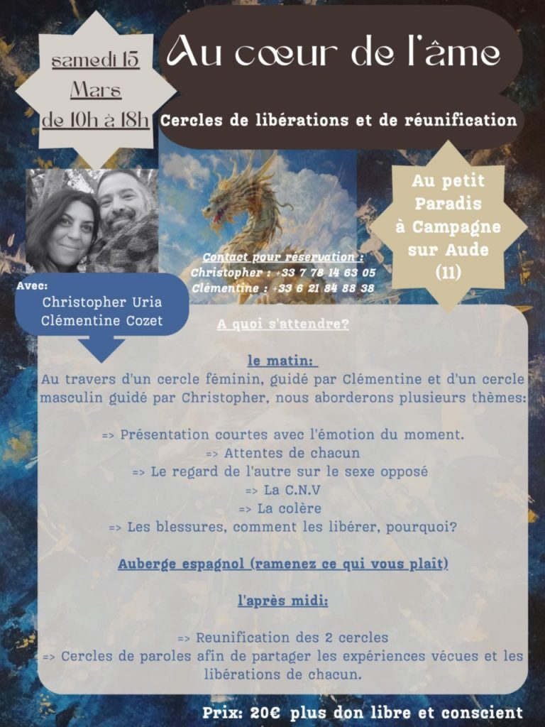 Samedi 15 mars, un cercle de femmes animé par Clémentine Cozet, et un cercle d’hommes organisé par moi-même, auront lieu à Campagne sur Aude au petit paradis, le matin dès 10h, jusqu’à 18h.