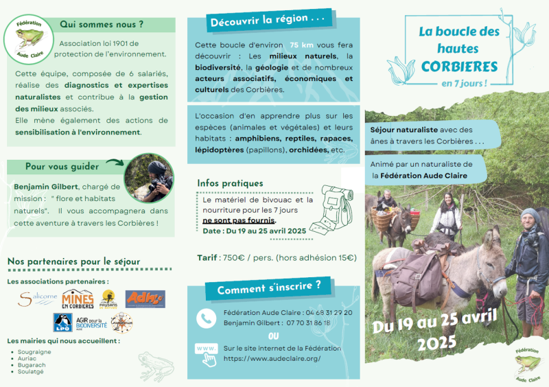 J’organise la découverte de la randonnée en itinérance, pendant 7 jours du 19 au 25 avril 2025, avec deux ânes, et pendant laquelle j’anime la botanique. Je porte le regard sur les plantes que nous croisons le long de notre parcours. En plus de la marche et de la botanique, le séjour est ponctué d’intervention pour faire découvrir notre patrimoine local (découvertes des fours verriers avec l’association la Salicorne, inventaires papillons de nuit avec les bénévoles de notre association, initiation à la géologique encore avec un bénévole de notre association, les oiseaux avec la LPO, découverte de mines avec Mines-en-Corbières, etc).