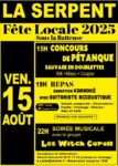 Fête de la Serpent organisée par le comité des fêtes du village Le 15 août 2025 à LA BATTEUSE à partir de 15 h pour le concours de pétanque sauvage en doublettes. 19 h le repas avec animation karaöké et guitare acoustique. 22h soirée musicale avec les witch Caroll 20€ le repas. salade composée, charcuterie, Paella ,fromage, glaces. Vin et café. Inscription avant le 12 août : Gérard Sansoz 04 68 31 75 52 b.castel@sbxinfo.fr N’hésitez pas à me contacter si vous avez besoin d’information complémentaires. Cordialement. Myriam Tulipier