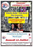 Bonjour à toutes et à tous Les animations continuent avec Capel Art à la chapellerie de Montazels Une modification toutefois pour le concert du 12 juillet à 18h : Katie James étant empêchée pour cette date, une solution de remplacement va être proposée avec la chanteuse Chilienne CELESTE SADIR et le duo CANTORES DUO (Argentine/Chili), toujours accompagnés par notre ami Luis SORIA. Et bien sûr les visites estivales de la chapellerie démarrent le 16 juillet cette année les LUNDIS et MERCREDIS à 10H00 jusqu’au 20 août. Merci de relayer ces informations Cordialement Claude CAUX pour Capel Art