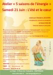 Samedi 21 Juin Atelier de Qi Gong saisonnier animé par Ghislaine et Daniel Le cinquième de ces ateliers de « Qi Gong de santé » nous relie à l’été et au Cœur. C’est l’énergie du FEU que vous découvrirez avec cet enchaînement qui vous permettra d’apaiser votre cœur et son trop plein d’énergie Yang propice aux migraines insomnies, tensions, jusqu’à la panique en cas d’excès. Cet enchaînement de 8 mouvements harmonieux nous permettra de régulariser la circulation sanguine, générant ainsi plus de joie, émotion associée au cœur. Un enseignement en naturopathie familiale présentant le système cardiaque vous proposera des réponses naturelles et une relaxation d’ouverture du cœur clôturera cet atelier Tarif 55€ / 65€ (non adhérents) Horaires : 9h-12h / 14h-17h30 Inscriptions :06 61 95 56 10 Association SynergétiK Le dojo fête ses 10 ans dojoesperaza.com Adhérer en ligne 09.54.59.38.15