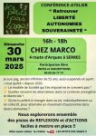 ➡️VENEZ NOMBREUXES ! Dans ce contexte social anxiogène et liberticide, partageons des pistes de réflexions et d’actions faciles à mettre en place lors d’une conférence-atelier « retrouver LIBERTÉ, AUTONOMIES et SOUVERAINETÉ » le dimanche 30 mars prochain de 16h à 18h chez Marco à Serres. Participation libre Inscriptions au 06.69.26.17.73