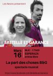 Lise (Moulin) et Vincent (Ruche), auteurs, compositeurs et interprètes, en tournée dans le Sud de la France, vous offrent une heure de chanson française dans un duo pétillant d’humour et de tendresse à capella ou presque. Spectacle au chapeau ! Quelques liens : La part des choses B&G Clip La Route Nouvel album B&G Il est des soirs B&G https://www.facebook.com/bretelle.et.garance Venez nombreux !