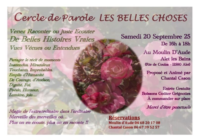 Cercle de paroles « Les belles choses » à Alet les bains le 20 septembre de admin | 20 septembre, 2015 - 9h50 |23 septembre, 2025 Archives Veuillez laisser ce champ vide Inscrivez-vous pour recevoir la lettre hebdomadaire(envoi chaque début de semaine)des infos en Haute Vallée de l'Aude Vérifiez votre boite de réception ou votre répertoire d’indésirables pour confirmer votre abonnement. Pour marque-pages : Permalien.