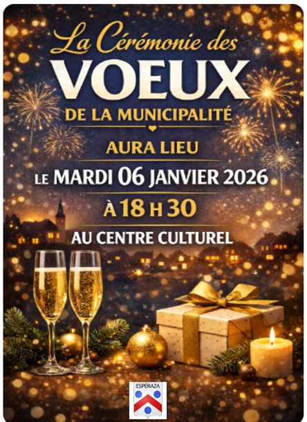 Cérémonie des vœux 2026 à Espéraza le mardi 06 janvier de admin | 6 janvier, 2016 - 21h14 |7 janvier, 2026 Archives Cérémonie des vœux 2026 Monsieur le Maire, Christian SOULA , et son équipe municipale ont le plaisir de vous inviter à la cérémonie des vœux. Mardi 06 janvier 2026 À 18h30 Centre Culturel Basset de Nattes Veuillez laisser ce champ vide Inscrivez-vous pour recevoir la lettre hebdomadaire(envoi chaque début de semaine)des infos en Haute Vallée de l'Aude Vérifiez votre boite de réception ou votre répertoire d’indésirables pour confirmer votre abonnement. Pour marque-pages : Permalien.