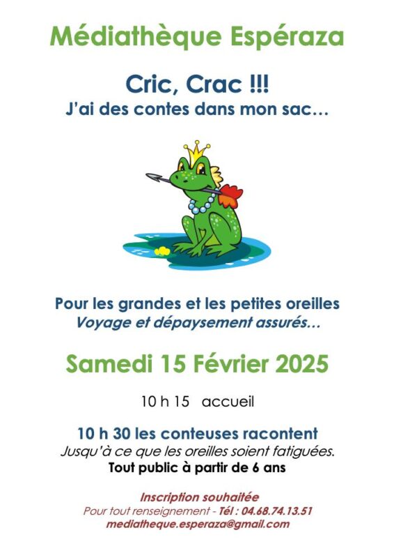 « J’ai des contes dans mon sac » Médiathèque d’Espéraza – Samedi 15 février de admin | 15 février, 2005 - 18h15 |17 février, 2025 Archives Médiathèque Municipale Espéraza – Tél : 04.68.74.13.51 mediatheque.esperaza@gmail.com Veuillez laisser ce champ vide Inscrivez-vous pour recevoir la lettre hebdomadaire(envoi chaque début de semaine)des infos en Haute Vallée de l'Aude Vérifiez votre boite de réception ou votre répertoire d’indésirables pour confirmer votre abonnement. Pour marque-pages : Permalien.