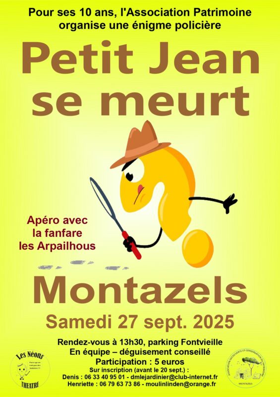 Énigme policière à Montazels le 27 septembre de admin | 27 septembre, 2015 - 20h27 |27 septembre, 2025 Archives IL RESTE QUELQUES PLACES. Si vous vous voulez vous inscrire encore, c’est maintenant ! Veuillez laisser ce champ vide Inscrivez-vous pour recevoir la lettre hebdomadaire(envoi chaque début de semaine)des infos en Haute Vallée de l'Aude Vérifiez votre boite de réception ou votre répertoire d’indésirables pour confirmer votre abonnement. Pour marque-pages : Permalien.