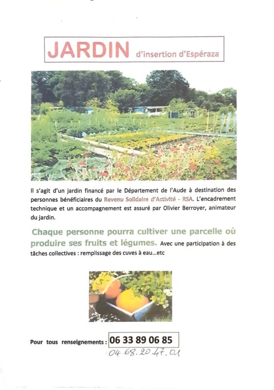 Envie d’un jardin sur Espéraza ? de admin | 22 mars, 2015 - 20h24 |13 mai, 2025 Archives Vous êtes au RSA, vous pouvez bénéficier gracieusement d’une parcelle, de graines, de plants potagers et de conseils de jardinage en appelant le 0633890685 Veuillez laisser ce champ vide Inscrivez-vous pour recevoir la lettre hebdomadaire(envoi chaque début de semaine)des infos en Haute Vallée de l'Aude Vérifiez votre boite de réception ou votre répertoire d’indésirables pour confirmer votre abonnement. Pour marque-pages : Permalien.