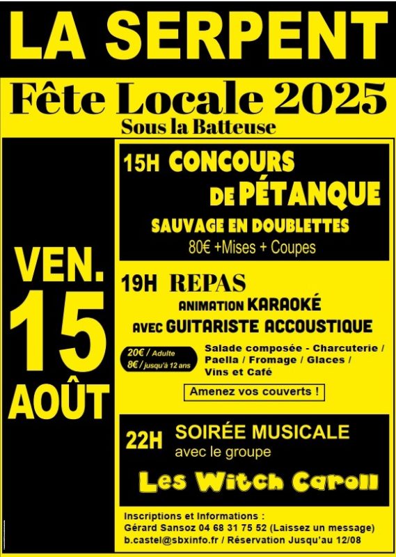 Fête de la Serpent organisée par le comité des fêtes du village Le 15 août 2025 à LA BATTEUSE à partir de 15 h pour le concours de pétanque sauvage en doublettes.