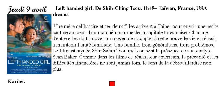 Film au ciné-club de Quillan le jeudi 9 avril de admin | 9 avril, 2016 - 21h58 |10 avril, 2026 Archives Toujours au Familia de Quillan à 20h30. Veuillez laisser ce champ vide Inscrivez-vous pour recevoir la lettre hebdomadaire(envoi chaque début de semaine)des infos en Haute Vallée de l'Aude Vérifiez votre boite de réception ou votre répertoire d’indésirables pour confirmer votre abonnement. Pour marque-pages : Permalien.