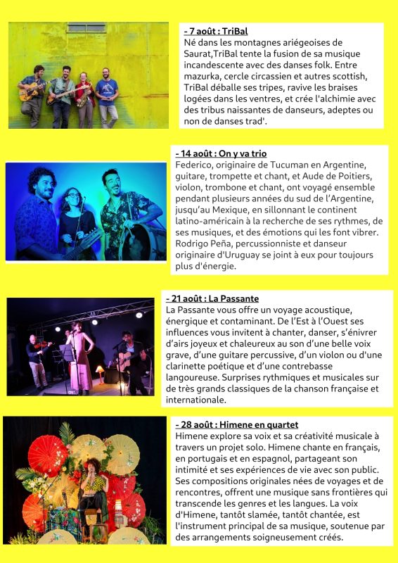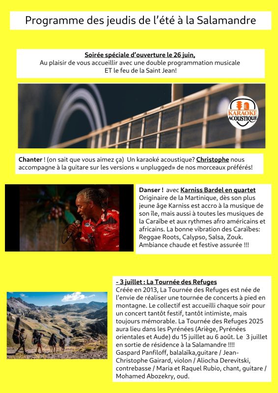 Les jeudis d’été à La Salamandre à Rodome de admin | 23 juin, 2015 - 22h38 |30 août, 2025 Archives Veuillez laisser ce champ vide Inscrivez-vous pour recevoir la lettre hebdomadaire(envoi chaque début de semaine)des infos en Haute Vallée de l'Aude Vérifiez votre boite de réception ou votre répertoire d’indésirables pour confirmer votre abonnement. Pour marque-pages : Permalien.