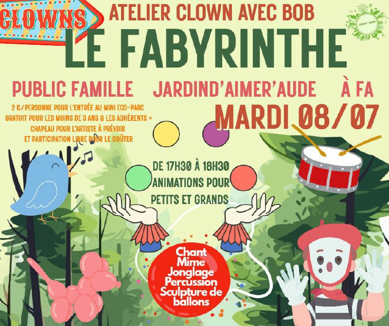 Bonjour mardi 8 juillet de 17h30 a 18h30 animation pour petit et grand chant mime clown jonglage percussion sculpture de ballons ….. participation au chapeau a Fa au Fabyrinthe ( là où ya Lumina Botanica) animé par Bob son site https://bmmmayoral.weebly.com/