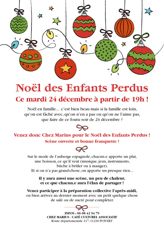 Noël des enfants perdus chez Marius le 24 décembre de admin | 24 décembre, 2014 - 0h33 |30 décembre, 2024 Archives Veuillez laisser ce champ vide Inscrivez-vous pour recevoir la lettre hebdomadaire(envoi chaque début de semaine)des infos en Haute Vallée de l'Aude Vérifiez votre boite de réception ou votre répertoire d’indésirables pour confirmer votre abonnement. Pour marque-pages : Permalien.