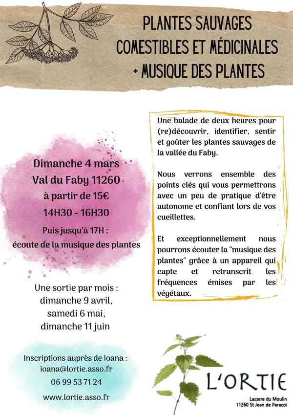 Plantes sauvages comestibles + écoute de la musique des plantes de admin | 15 février, 2013 - 11h09 |22 juillet, 2014 Archives http://lortie.asso.fr Veuillez laisser ce champ vide Inscrivez-vous pour recevoir la lettre hebdomadaire(envoi chaque début de semaine)des infos en Haute Vallée de l'Aude Vérifiez votre boite de réception ou votre répertoire d’indésirables pour confirmer votre abonnement. Pour marque-pages : Permalien. « Écriture inspirée VENDREDI SOIR : ROCK’ N’ SOUP! / SAMEDI SOIR : SPECTACLE/HUMOUR LES DÉLIRES D’ANNE LA BELGE. » Les commentaires sont fermés. Rechercher : RechercherOK MétéoESPÉRAZA WEATHER
