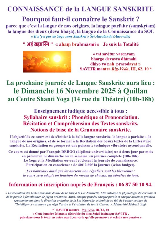 Je suis heureux de vous informer que notre prochaine journée d’Étude de Langue et des Textes sanskrits ⁠aura lieu le Dimanche 16 Novembre 2025 au Centre Shanti Yoga à Quillan, 14 rue du théâtre (10h-18h).