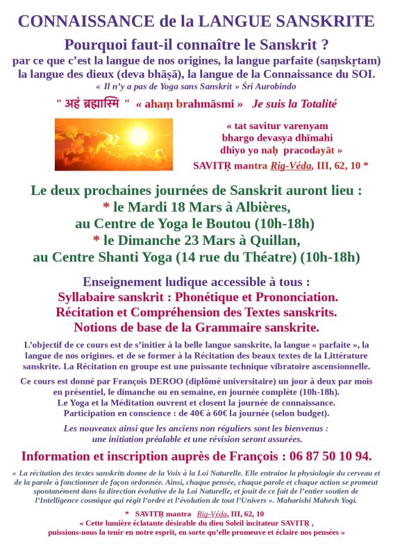 Je suis heureux de vous convier aux deux prochaines journées d’Enseignement de Langue sanskrite :