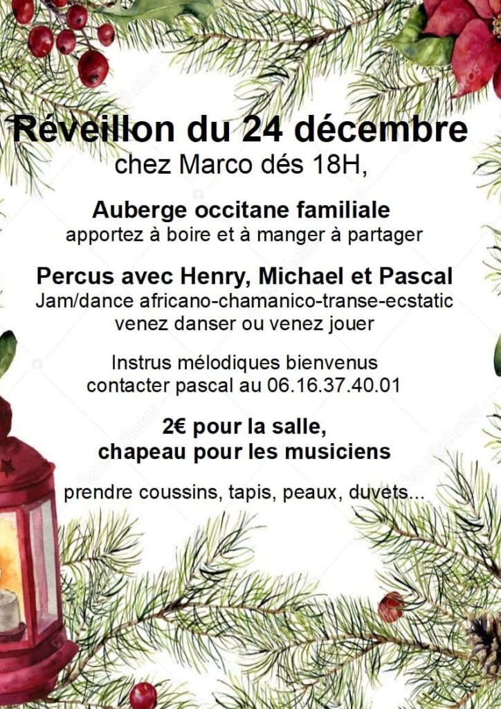 Réveillon du 24 décembre chez Marco à Serres de admin | 24 décembre, 2014 - 20h31 |30 décembre, 2024 Archives Invitation pour le réveillon de Noël. Végétarien, sans fumée ni alcool (à part la blanquette). Amenez un petit cadeau (moins de 5€) pour partager. Veuillez laisser ce champ vide Inscrivez-vous pour recevoir la lettre hebdomadaire(envoi chaque début de semaine)des infos en Haute Vallée de l'Aude Vérifiez votre boite de réception ou votre répertoire d’indésirables pour confirmer votre abonnement. Pour marque-pages : Permalien.