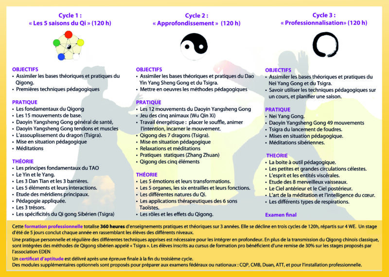Ghislaine LOCICERO, Daniel VIOLON et Eric AUGOYARD vous accompagnent pendant 3 années sur ce chemin passionnant qui vous permettra de rentrer pleinement dans la compréhension et l’expérience de cet art traditionnel chinois et de découvrir la richesse de son cousin sibérien, le Tsigra.