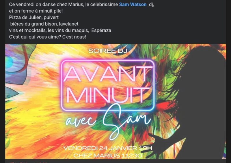Soirée « Avant minuit » chez Marius à Puivert, vendredi 24 janvier de admin | 24 janvier, 2015 - 19h21 |25 janvier, 2025 Archives Veuillez laisser ce champ vide Inscrivez-vous pour recevoir la lettre hebdomadaire(envoi chaque début de semaine)des infos en Haute Vallée de l'Aude Vérifiez votre boite de réception ou votre répertoire d’indésirables pour confirmer votre abonnement. Pour marque-pages : Permalien.