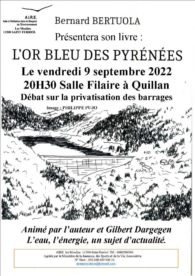 « SOIRÉE DÉBAT L’EAU, L’ENERGIE, et sujets d’actualité – vendredi 9 septembre 2022 à 20h30 salle Filaire à Quillan
