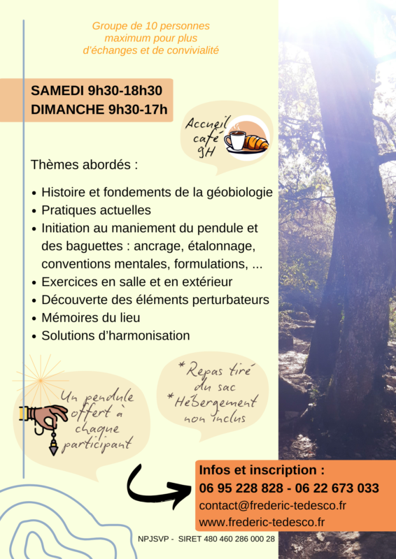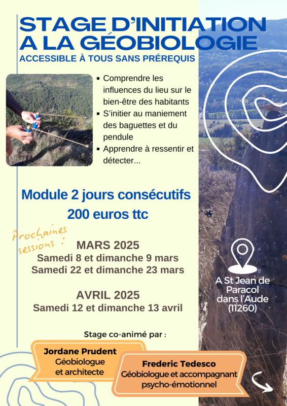 Nous proposons un module d’initiation à la géobiologie sur deux jours, à Saint Jean de Paracol, avec théorie et mise en pratique.