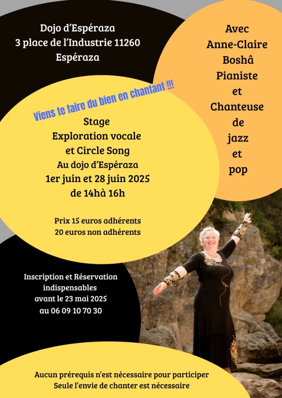 Anne Claire Boshâ propose au Dojo un stage de chant les dimanche 1er juin et samedi 28 juin.