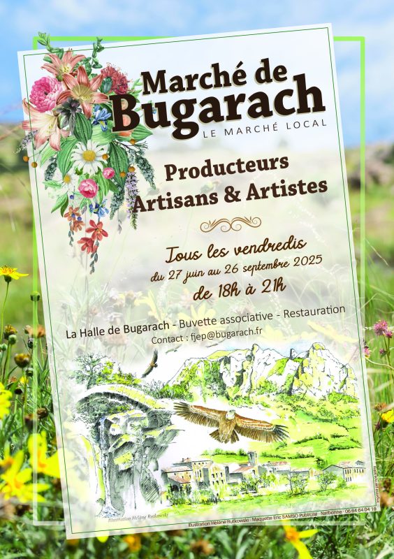 Marché de producteurs et d’ artisans sous la halle de Bugarach avec buvette, animation musicale et restauration sur place.