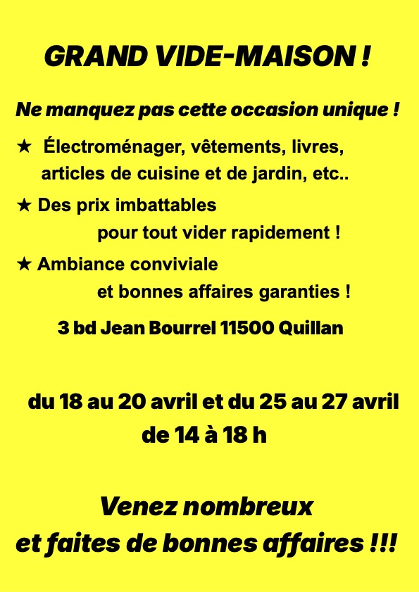 VIDE-MAISON à QUILLAN les DEUX DERNIERS week-ends d’AVRIL de admin | 18 avril, 2015 - 19h52 |21 avril, 2025 Archives Veuillez laisser ce champ vide Inscrivez-vous pour recevoir la lettre hebdomadaire(envoi chaque début de semaine)des infos en Haute Vallée de l'Aude Vérifiez votre boite de réception ou votre répertoire d’indésirables pour confirmer votre abonnement. Pour marque-pages : Permalien.